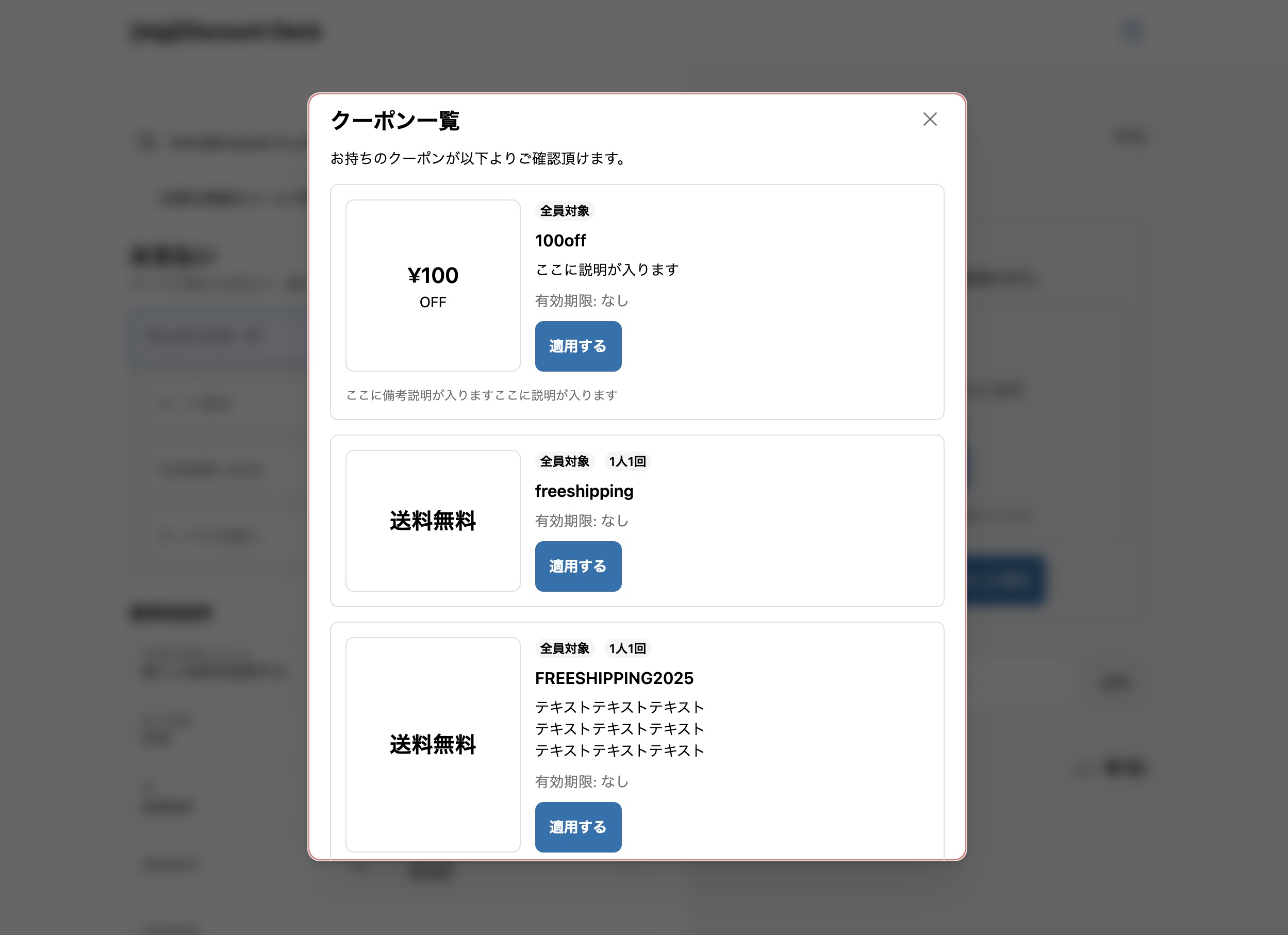 クーポンをもっと見る、ボタンを押すとこちらのポップアップが表示されます。